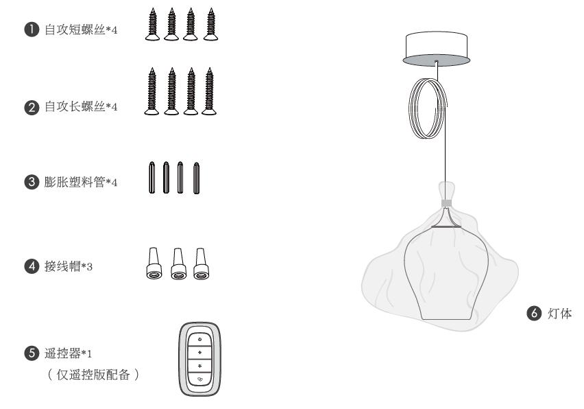 自攻短螺丝*4;自攻长螺丝*4;膨胀塑料管*4;接线帽*4 遥控器*1(遥控版本);灯体*1;