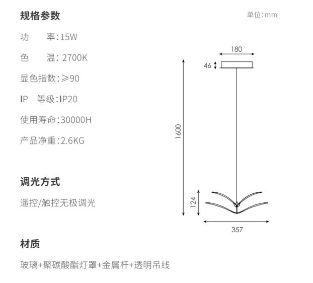 如翼吊灯用双层弯曲的造型作为主要造型特征形成在空间里自由灵动的造型,,,,以一定的角度倾斜,,,形成丰富的画面,,,两翼的线条均为精心设计,,,,精准控制光线的传播,,将直下光和漫反射光结合,,70%灯光向下,,,,30%灯光向上,,,,在空间里形成舒适的光学效果,,,,下灯罩为片状玻璃印刷专门调制的乳白色油墨,,热弯成对应弧度,,,,灯光透过灯罩呈现出更加柔和的视觉效果;边缘特意留有5mm宽度透明环,,,,使视觉更精致轻巧;灯罩利用两个金属“领夹”式的杆连接固定,,整体视觉优雅;