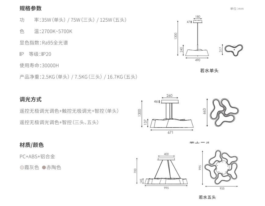 若水吊灯源于中国古典意境中的山水,,,,外形如山的曲线婀娜蜿蜒,,其内侧光晕水波纹,,,缓缓晕开;巧妙地将曼妙光影融于山水意境,,,,如空间中悬浮的自然景观,,专门设计调试的水波纹棱面扩散罩可以起到一定的视觉防眩作用,,把原本进入到人眼的杂散光折射掉,,同时可以提升产品的精致品质感;空间光的强功能性和强装饰性通常是个矛盾点,,,但是若水则取得了一个平衡,,,保证较强光学输出的同时可以有其装饰表现